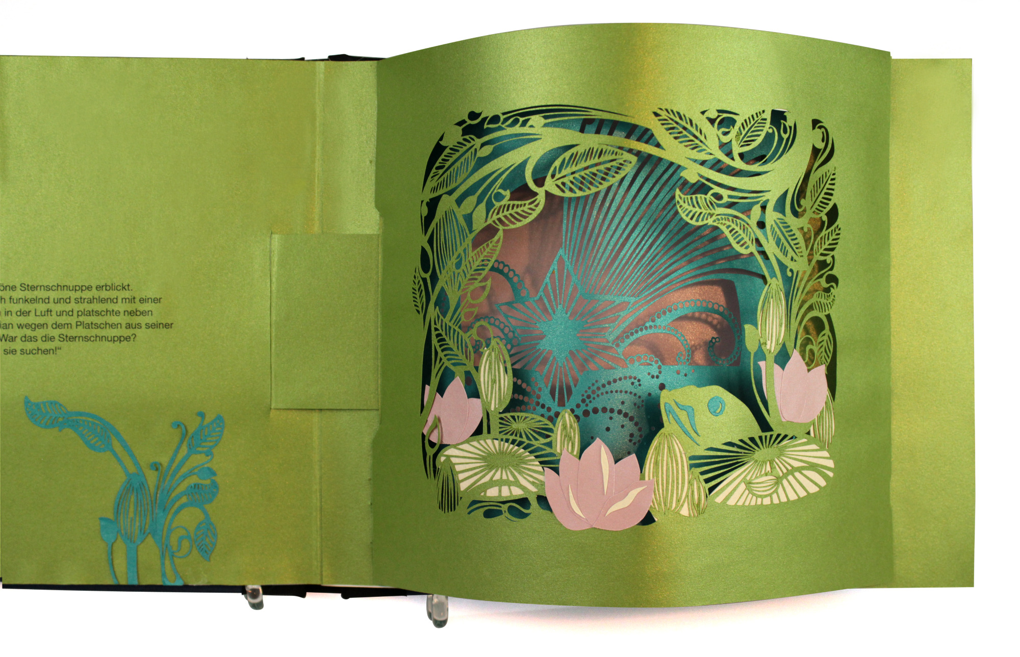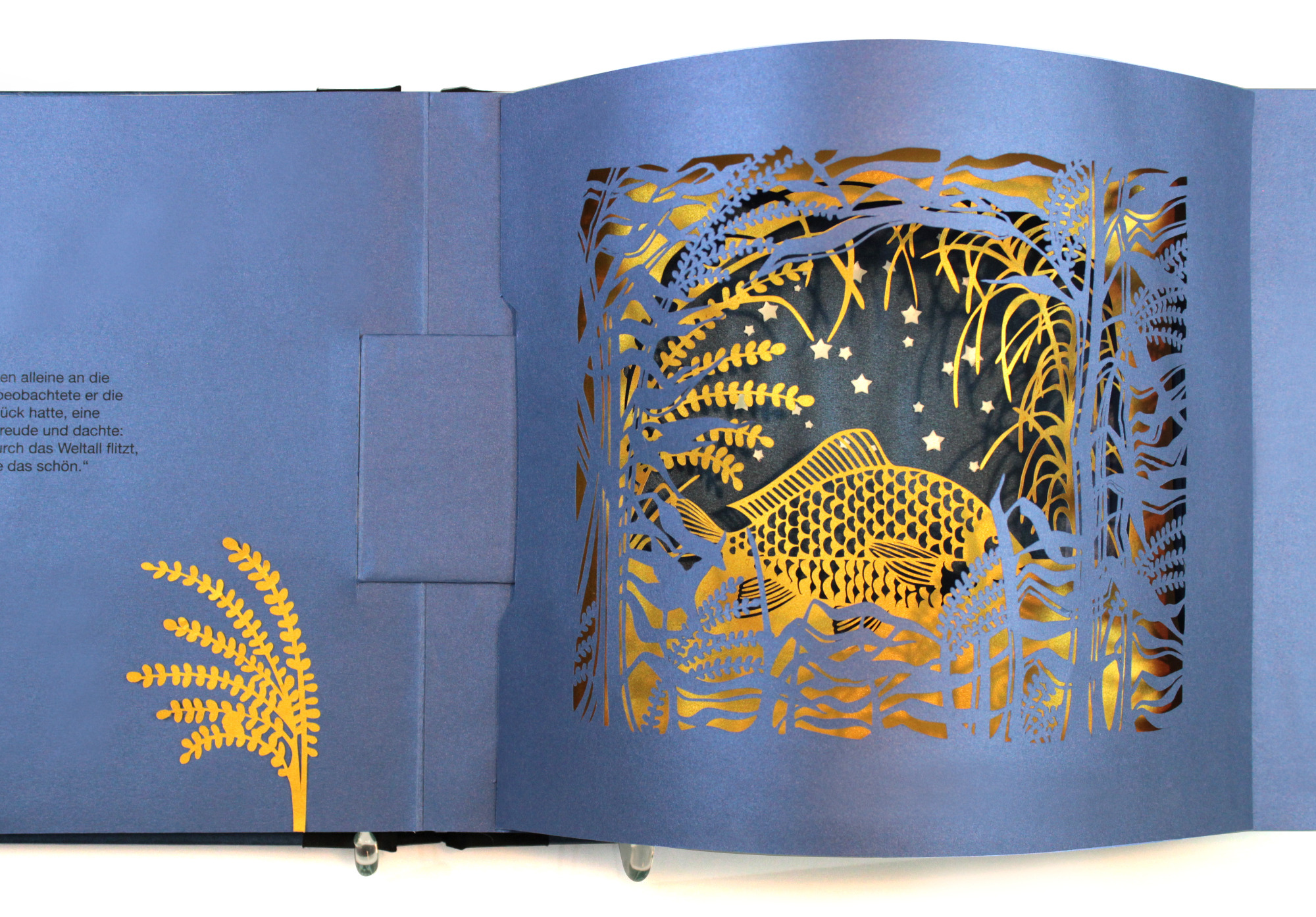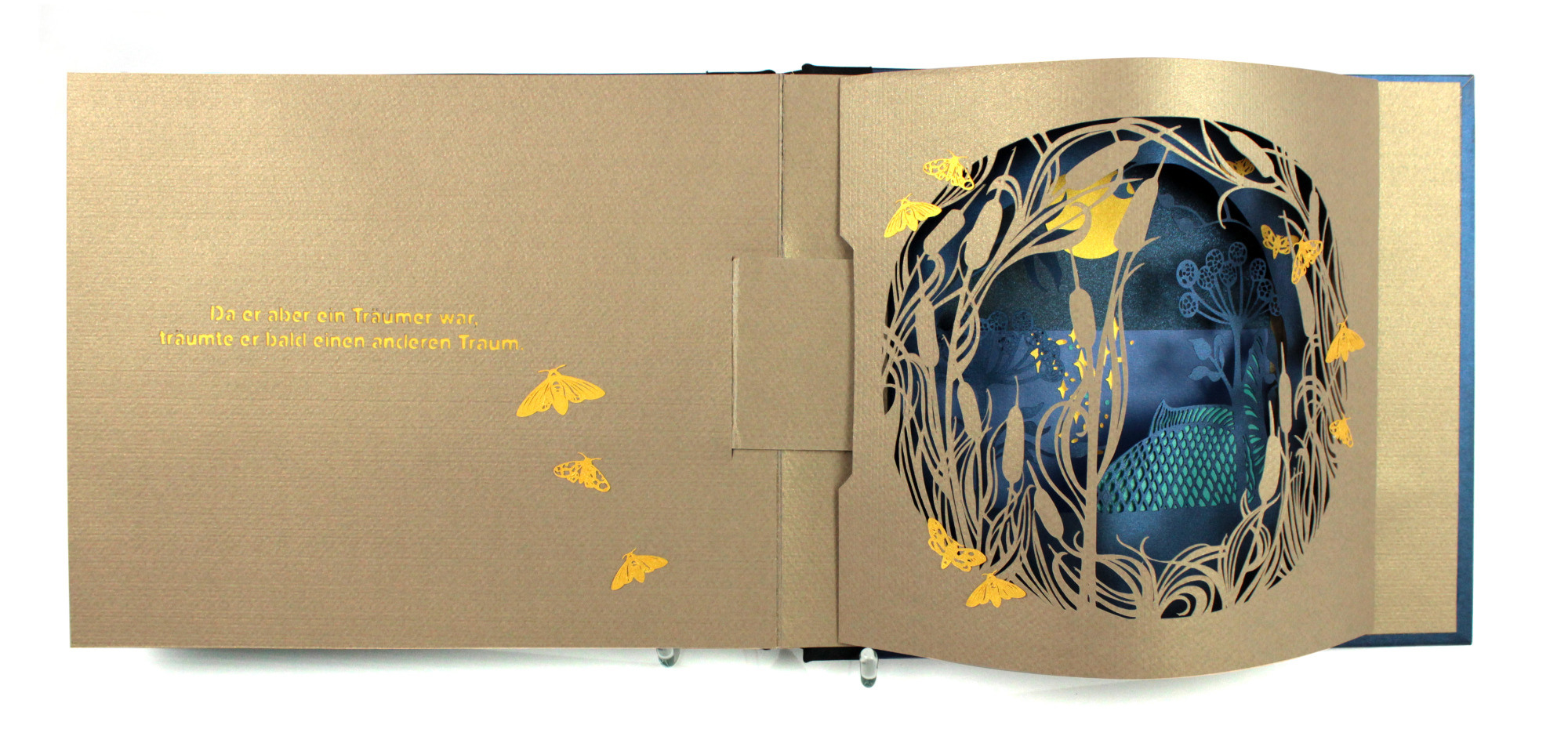 Beim Aufschlagen der Seiten entsteht eine kleine Bühne. Schicht für Schicht öffnet sich eine schillernde Traumwelt aus unzähligen filigranen Laser-Cut-Elementen. Die einzelnen Silhouetten fügen sich zu einem Bild von beeindruckender Tiefe zusammen und laden dazu ein, in eine fragile, fast magische Szenerie einzutauchen. Freies Projekt