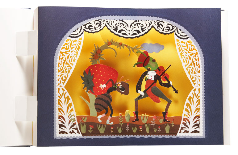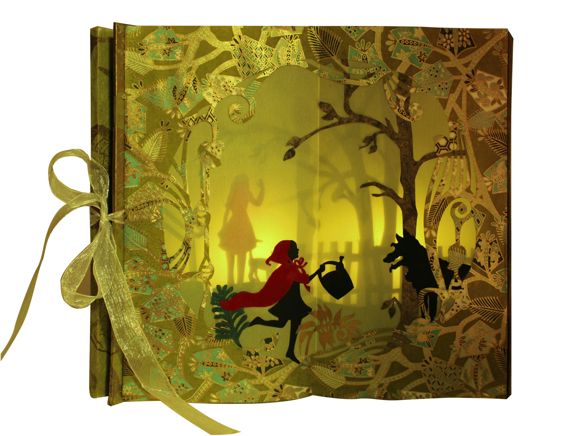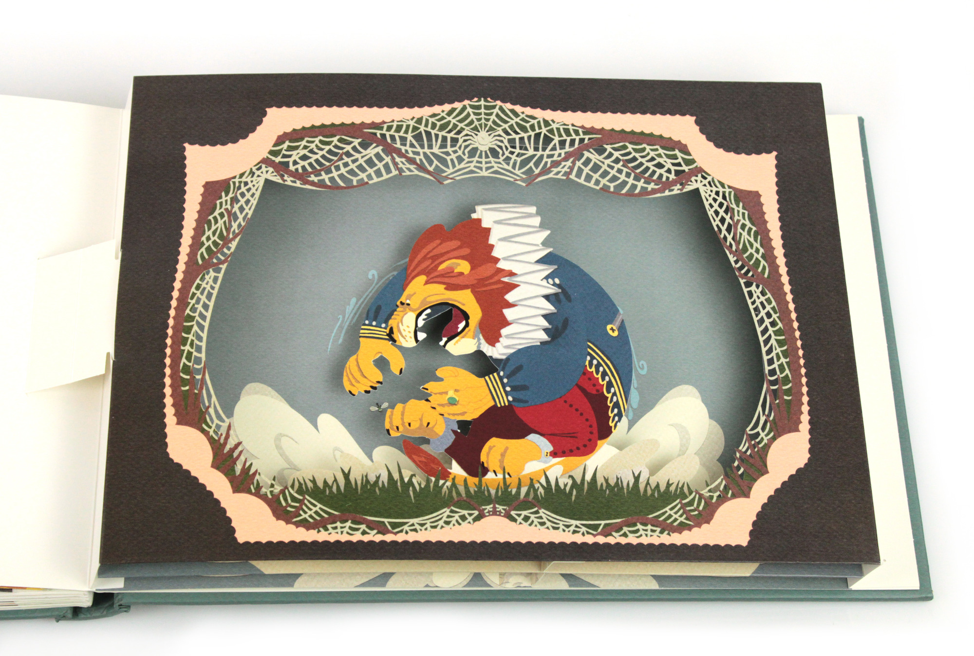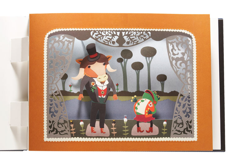 Beim Aufschlagen der Seiten entsteht eine kleine Bühne. Schicht für Schicht öffnet sich eine schillernde Traumwelt aus unzähligen filigranen Laser-Cut-Elementen. Die einzelnen Silhouetten fügen sich zu einem Bild von beeindruckender Tiefe zusammen und laden dazu ein, in eine fragile, fast magische Szenerie einzutauchen. Freies Projekt