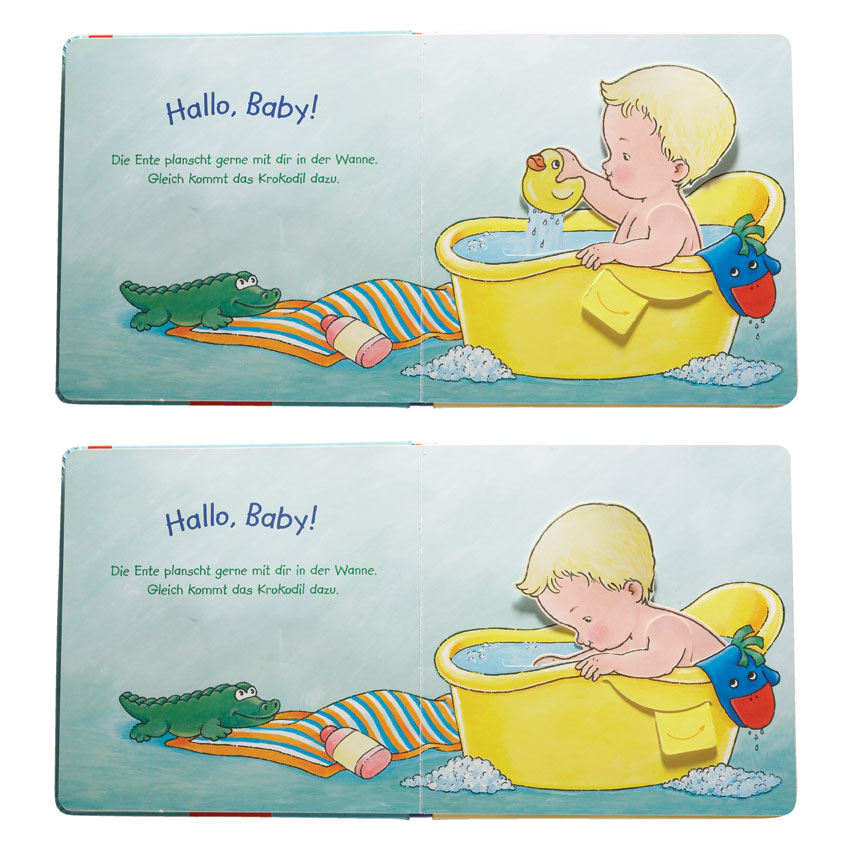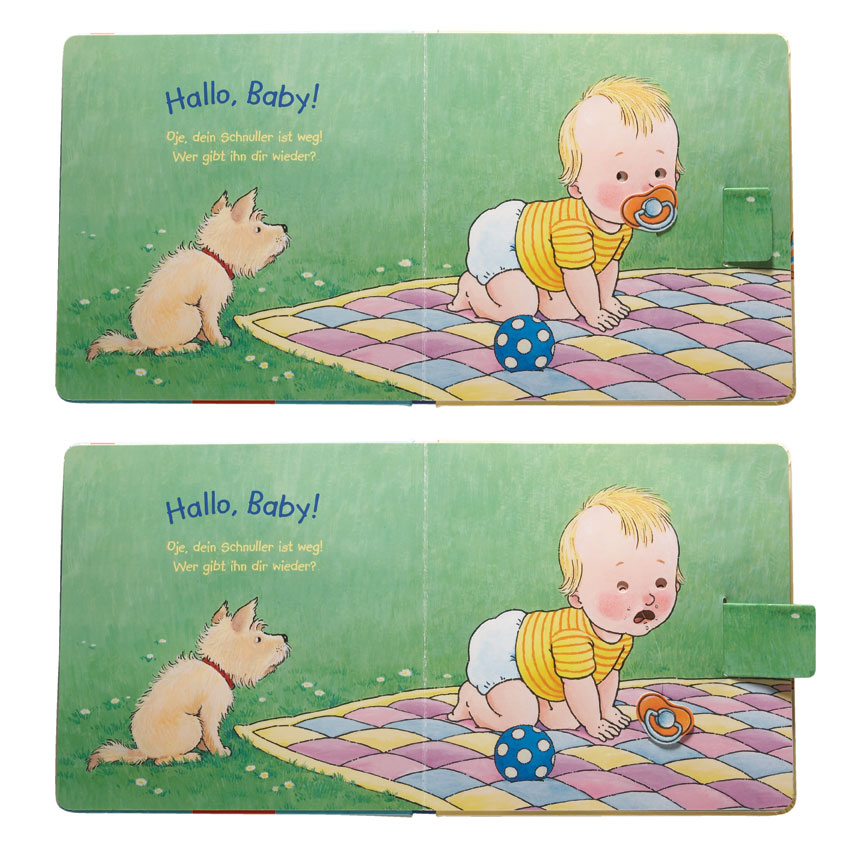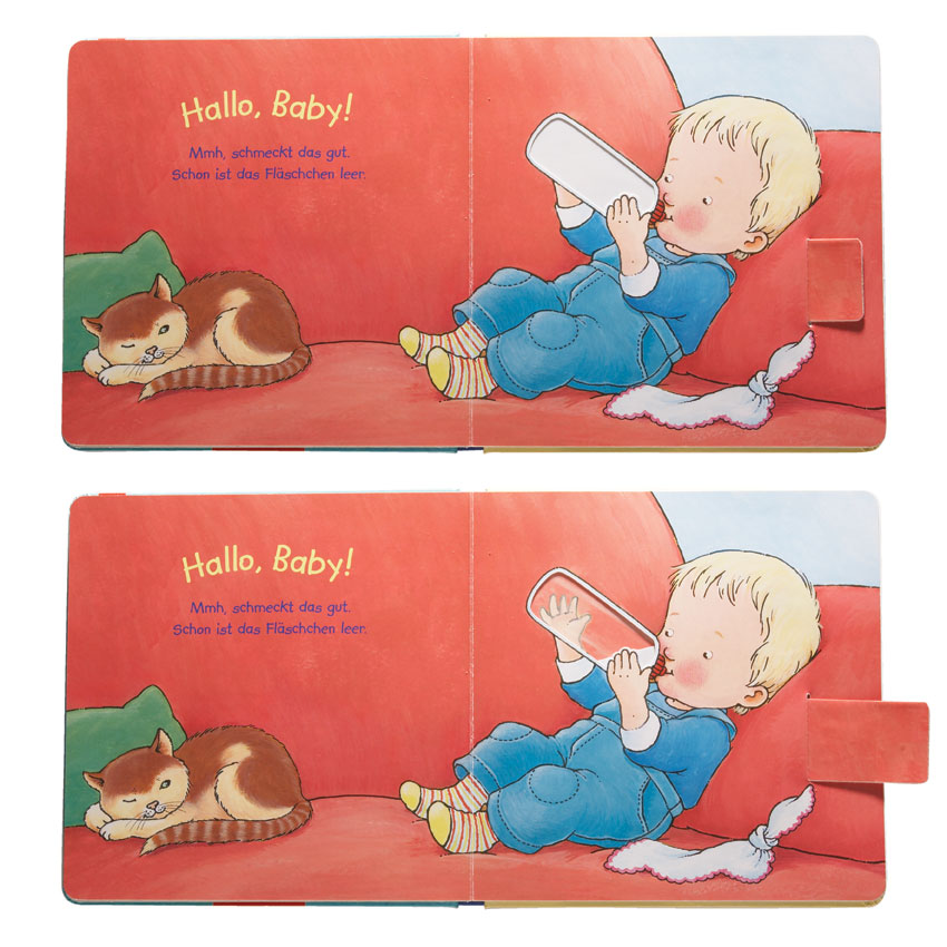 Dieses Activity Book arbeitet mit einfachen Pull-Tabs, die speziell für kleinere Kinder geeignet sind. Durch das Ziehen der Tabs verändern sich die dargestellten Szenen auf intuitive Weise – etwa wenn ein Baby seinen Schnuller ausspuckt oder sein Fläschchen leer trinkt. Inhalte werden so spielerisch und visuell erfahrbar gemacht.