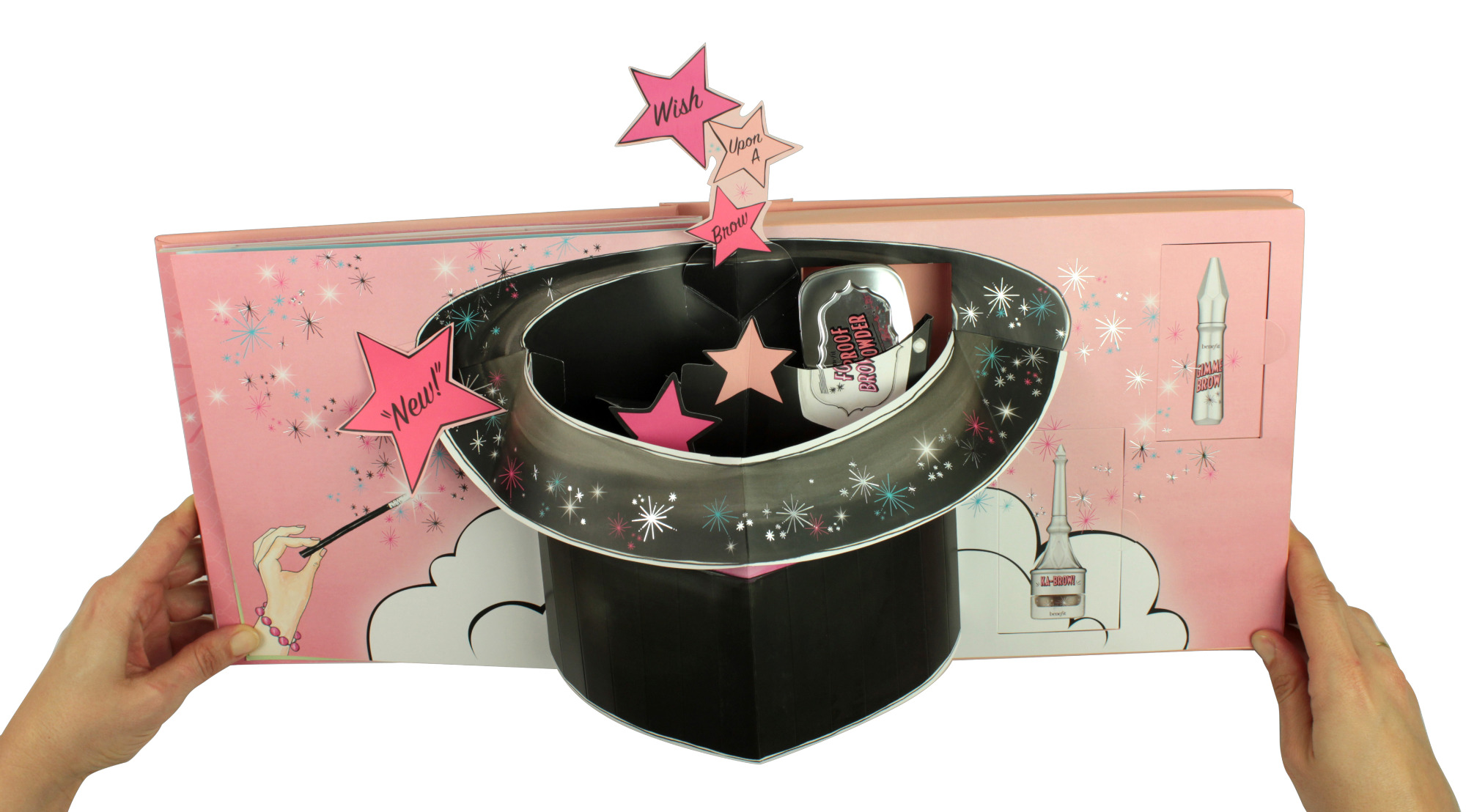Ein einzigartiges Pop-up-Buch, vollständig von mir gestaltet – von Illustration und Layout bis hin zum anspruchsvollen Paper Engineering – präsentiert ausgewählte Produkte von benefit cosmetics auf besonders eindrucksvolle Weise. Interaktive Elemente wie raffinierte Pull Tabs lassen die Beauty-Highlights lebendig werden und schaffen ein spielerisches Markenerlebnis. Als spektakulärer Abschluss verbirgt die letzte Seite ein echtes Produkt, das beim Öffnen aus einem Zauberhut hervorgeholt werden kann.