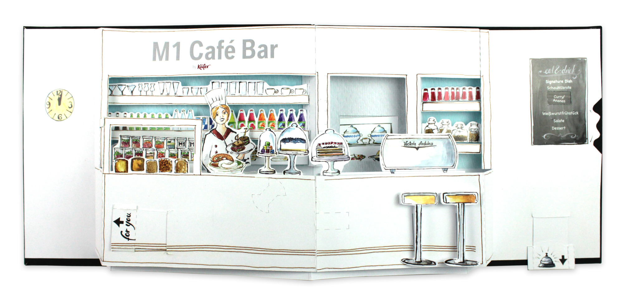 Ein charmantes, dreidimensionales Büdchen entfaltet sich beim Öffnen der Seite und zieht sofort alle Blicke auf sich. Mit viel Liebe zum Detail entwickelt und speziell für eine eindrucksvolle Präsentation umgesetzt, sorgte es für einen überraschenden, lebendigen Effekt.